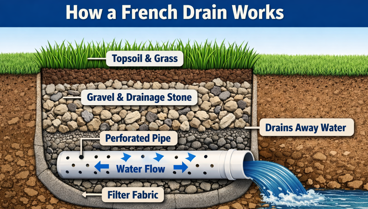 Usually that means a trench with stone and a perforated pipe inside it. Water enters the trench, gets picked up by the system, and is directed away from the area that keeps staying wet. That might be away from the house. Away from a patio. Away from a soggy lawn section. Away from a side yard where water keeps pooling.